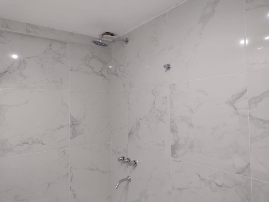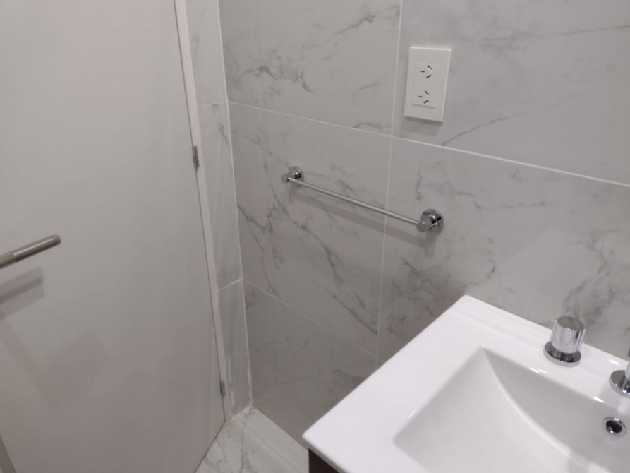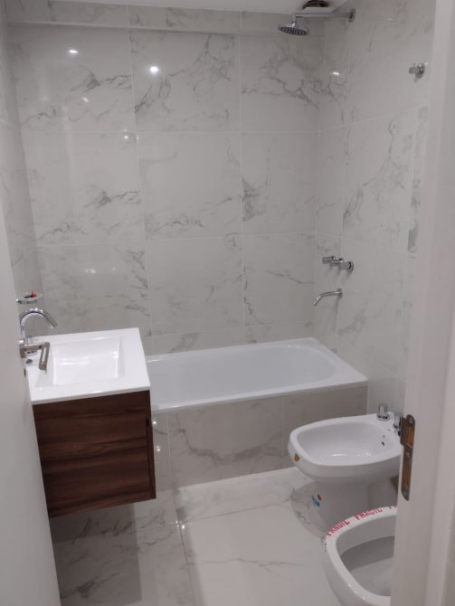 FINALMENTE SE ENCUENTRA EL IMPECABLE BAÑO CON BAÑERA, TOTALMENTE REVESTIDO EN PORCELANATTO, CON MODERNO VANITORY Y GRIFERÍA Y ACCESORIOS COMPLETOS.